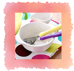 発達に合わせた形状の食具や、食事形態に合わせた食器を使用し、発達とともに スプーンからお箸へ、手つきお椀からお椀へ、食器も大きさ、重さを考え使用して います。